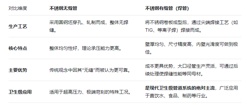 要做出正確選擇,首先需要明白,“衛(wèi)生級(jí)”是一個(gè)關(guān)于材質(zhì)純凈度、表面光潔度和工藝衛(wèi)生的標(biāo)準(zhǔn),而非指管道成型工藝。 符合標(biāo)準(zhǔn)的不銹鋼管,既可以是無(wú)縫管,也可以是有縫管(即焊管),二者在性能和應(yīng)用上各有側(cè)重。