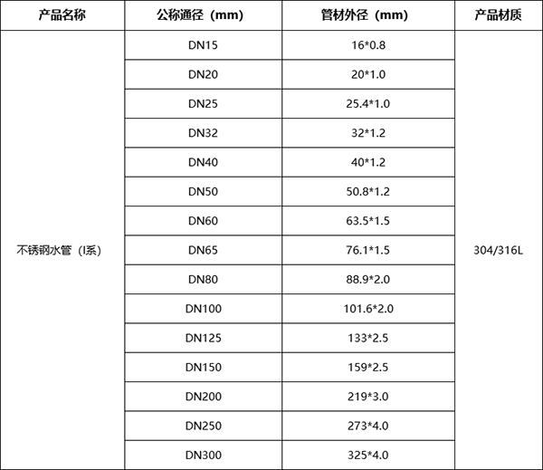 以下是根據(jù)國家標(biāo)準(zhǔn)制定的 “不銹鋼水管(I系)”典型規(guī)格表,它廣泛應(yīng)用于冷熱水、直飲水、醫(yī)用氣體等高標(biāo)準(zhǔn)流體輸送系統(tǒng)。